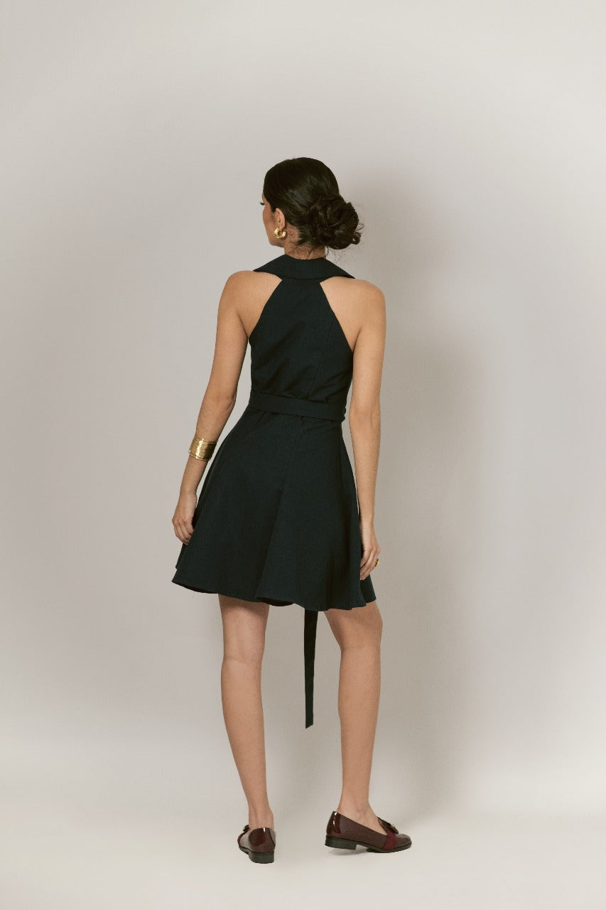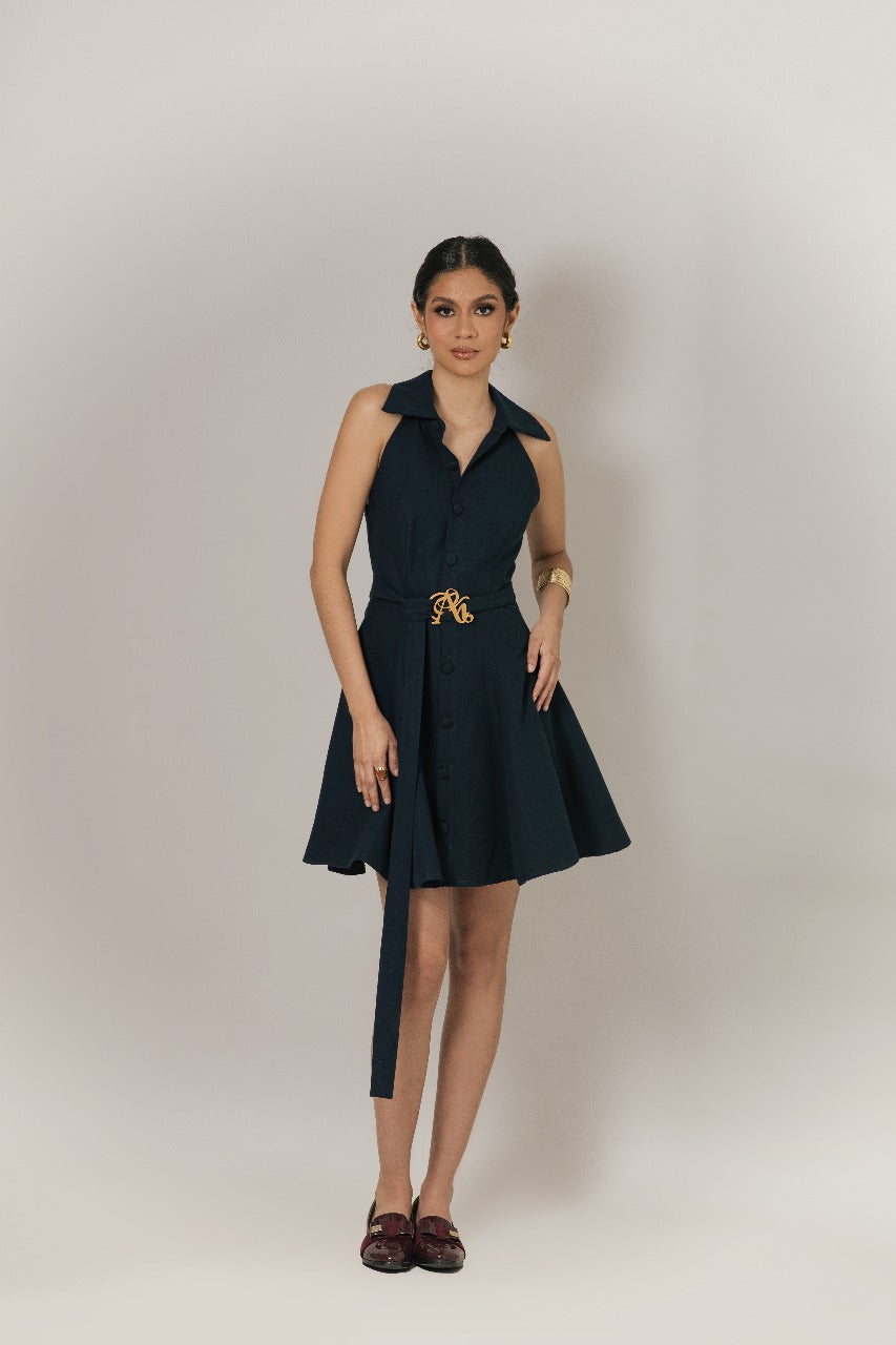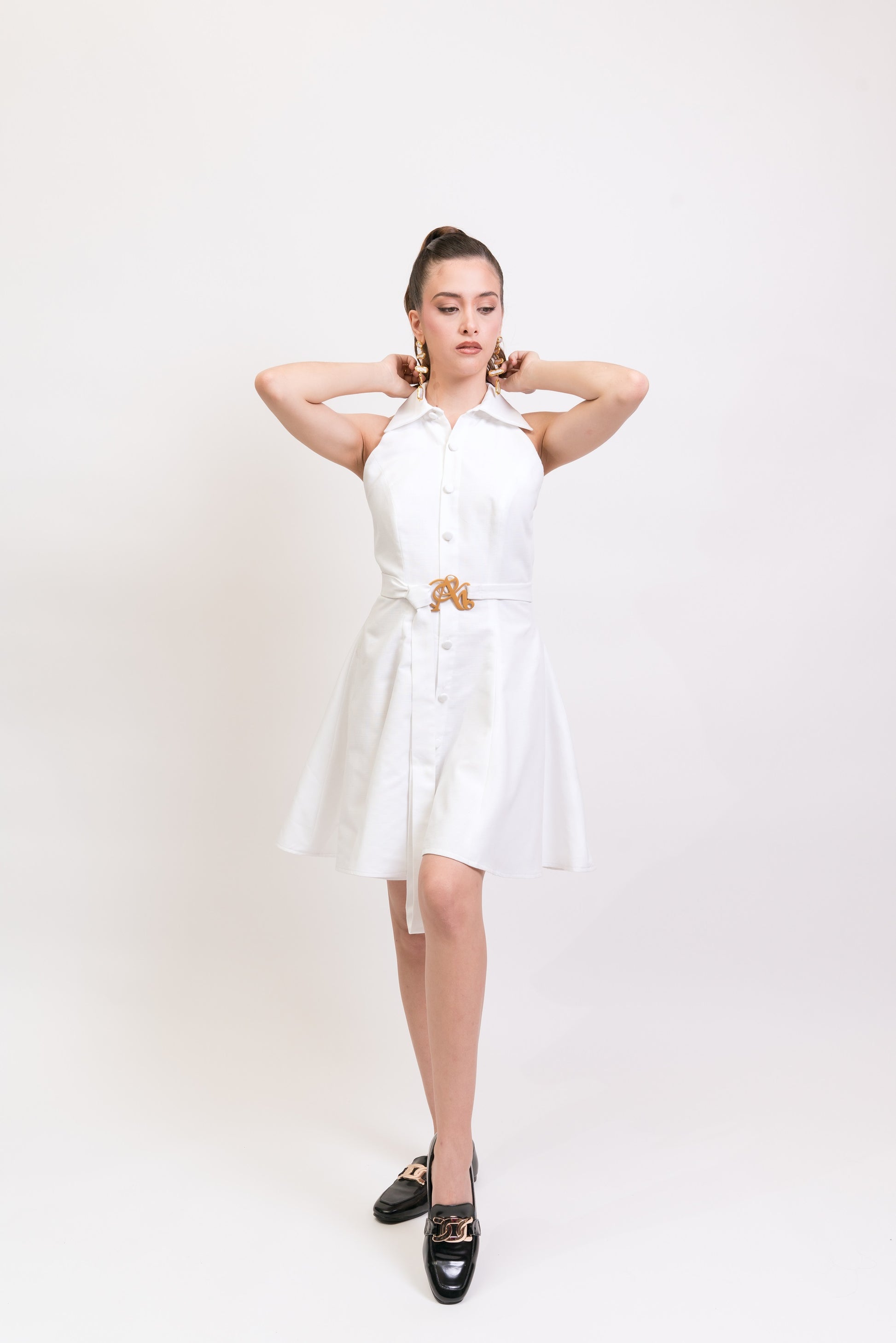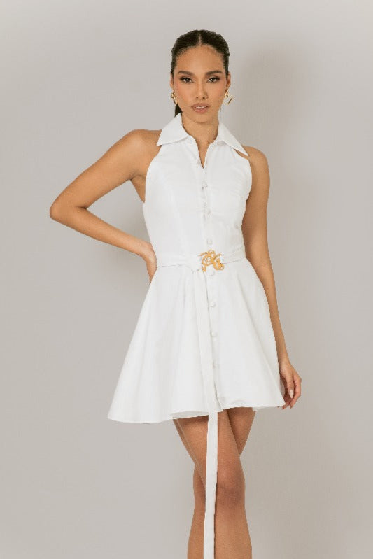 Vestido blanco estilo camisero, sin mangas y con botones al frente. Con un cinturón que realza la silueta, ofrece un toque moderno y femenino. Perfecto para quienes buscan comodidad y estilo en una sola prenda.