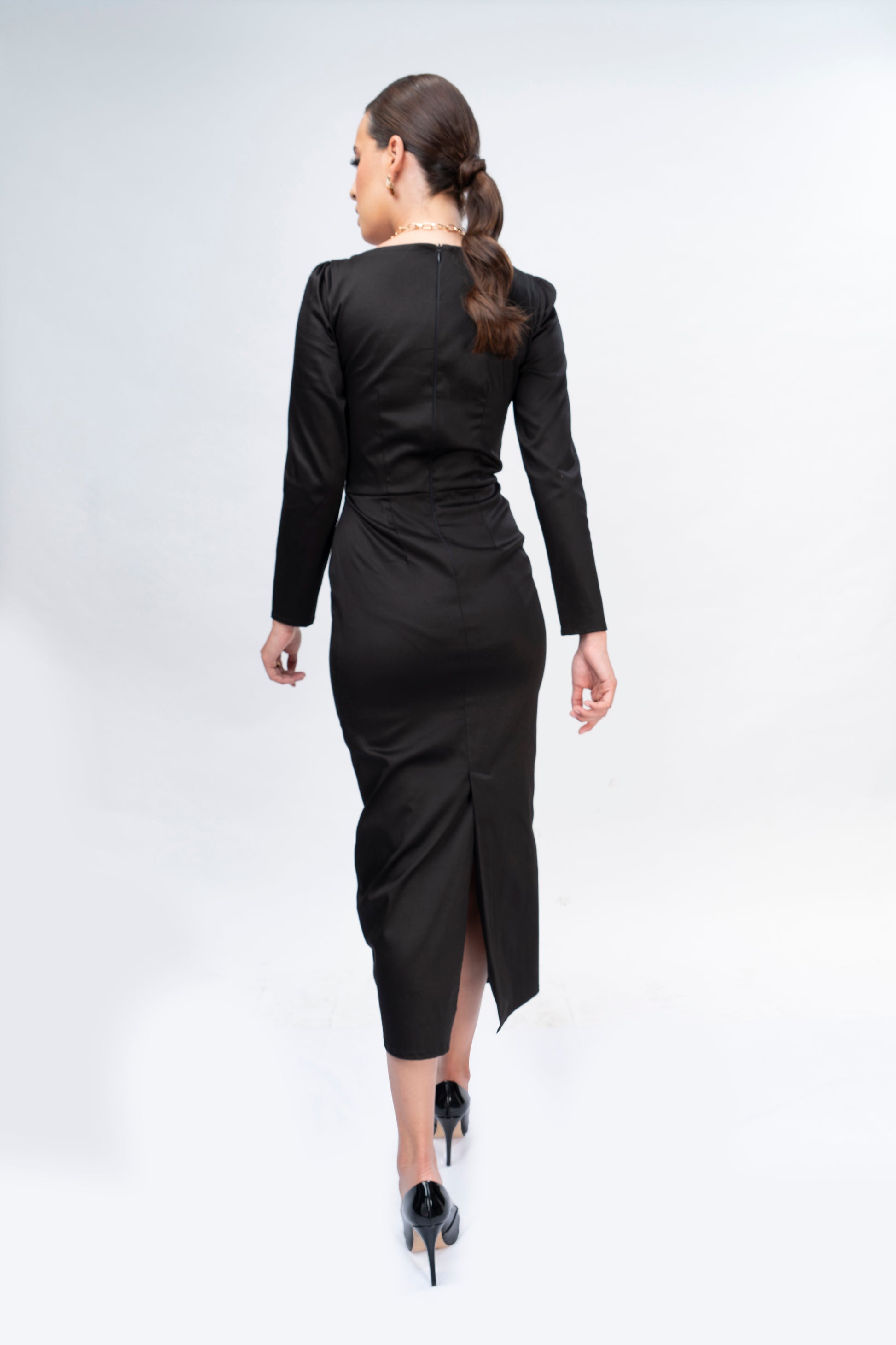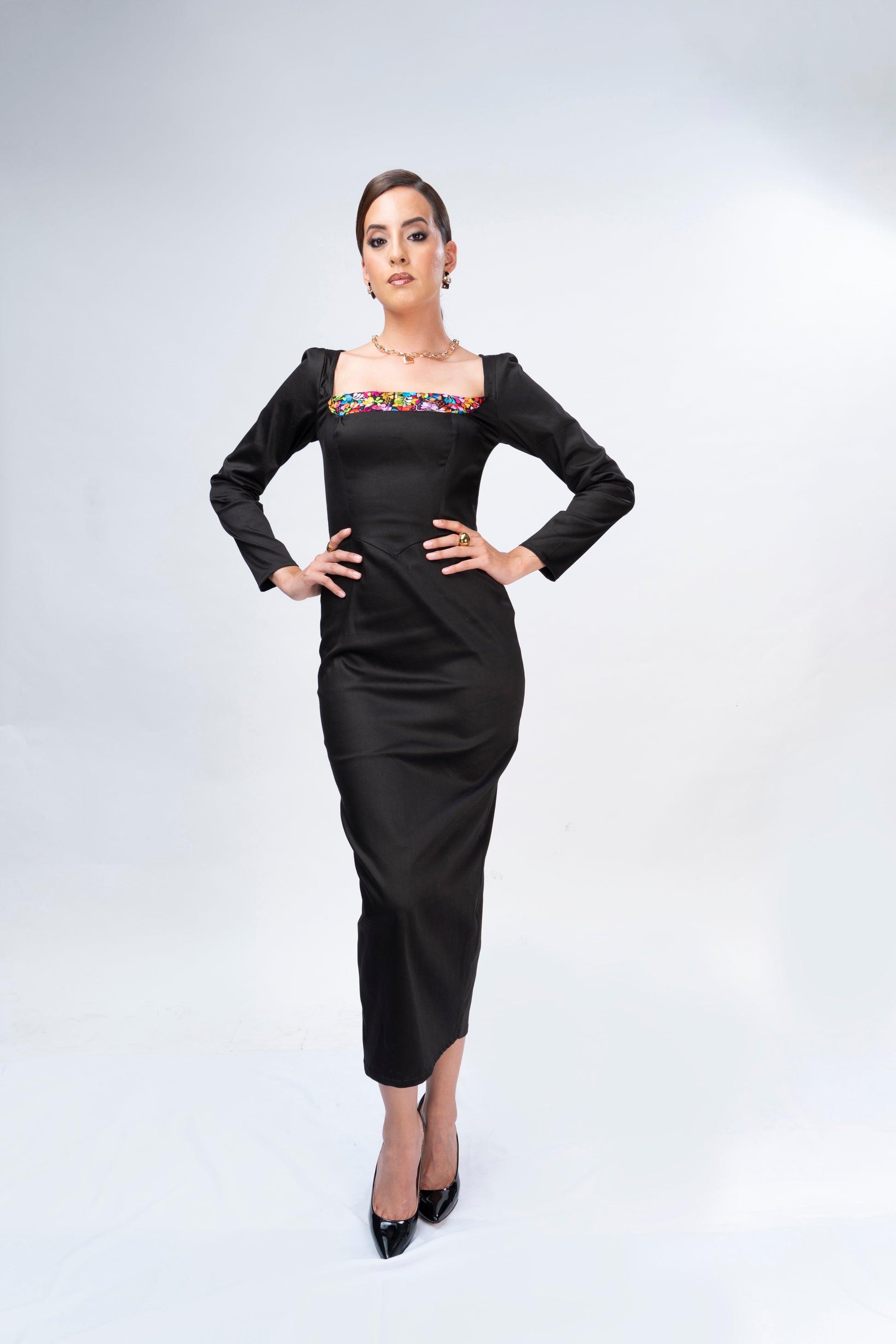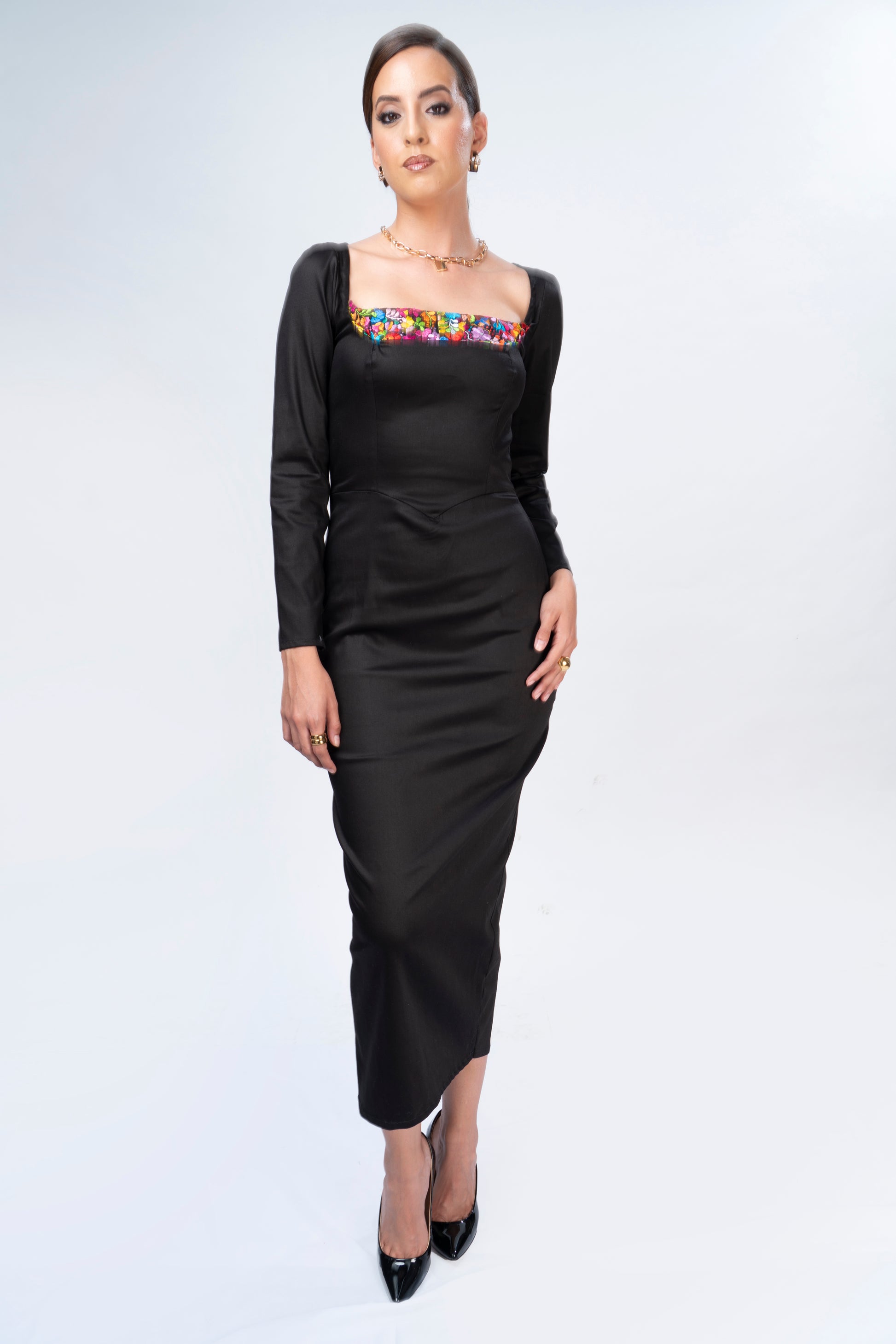 Vestido formal de algodón strech, con bordado de San Antonino Castillo Velasco, cuello cuadrado y falda lápiz