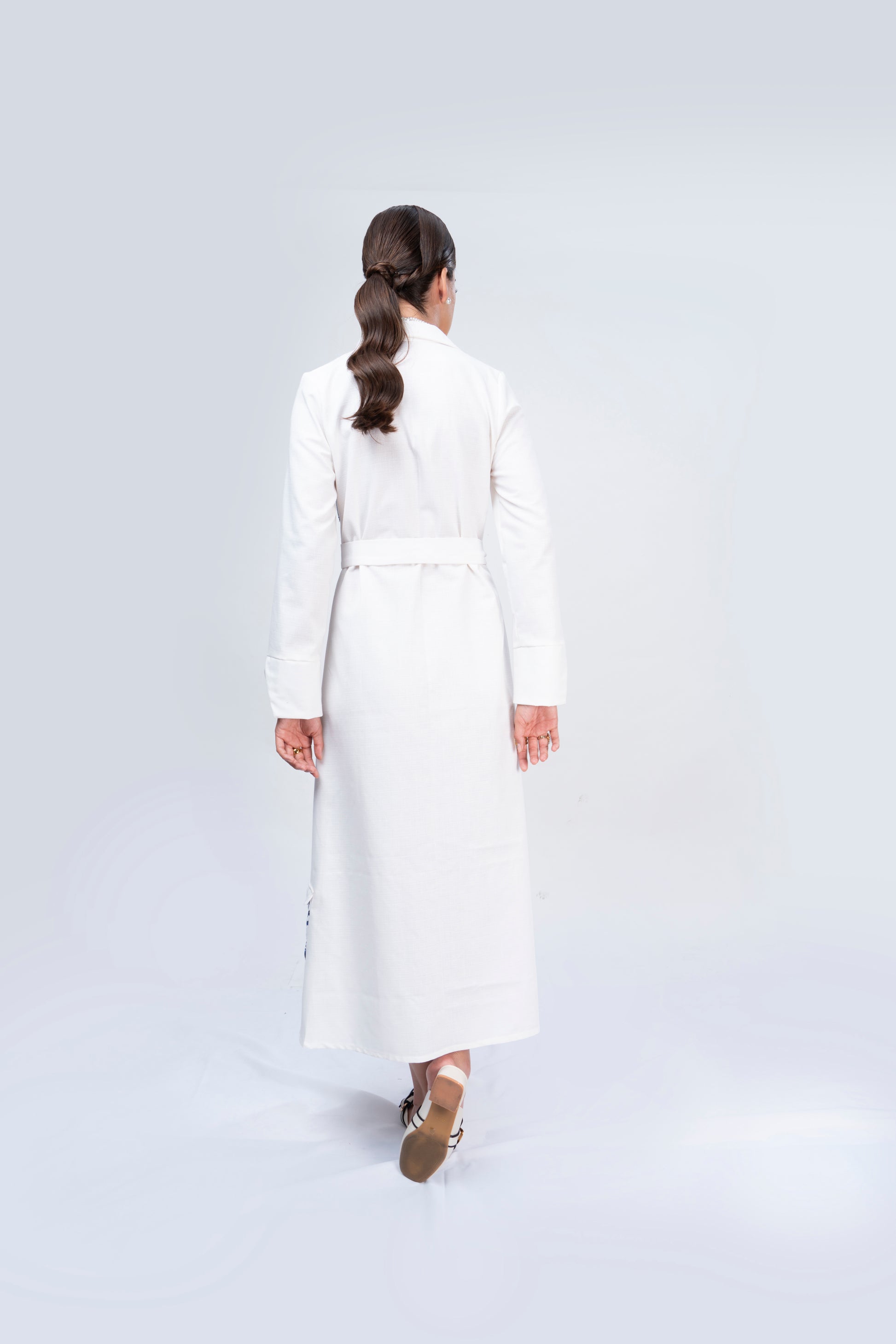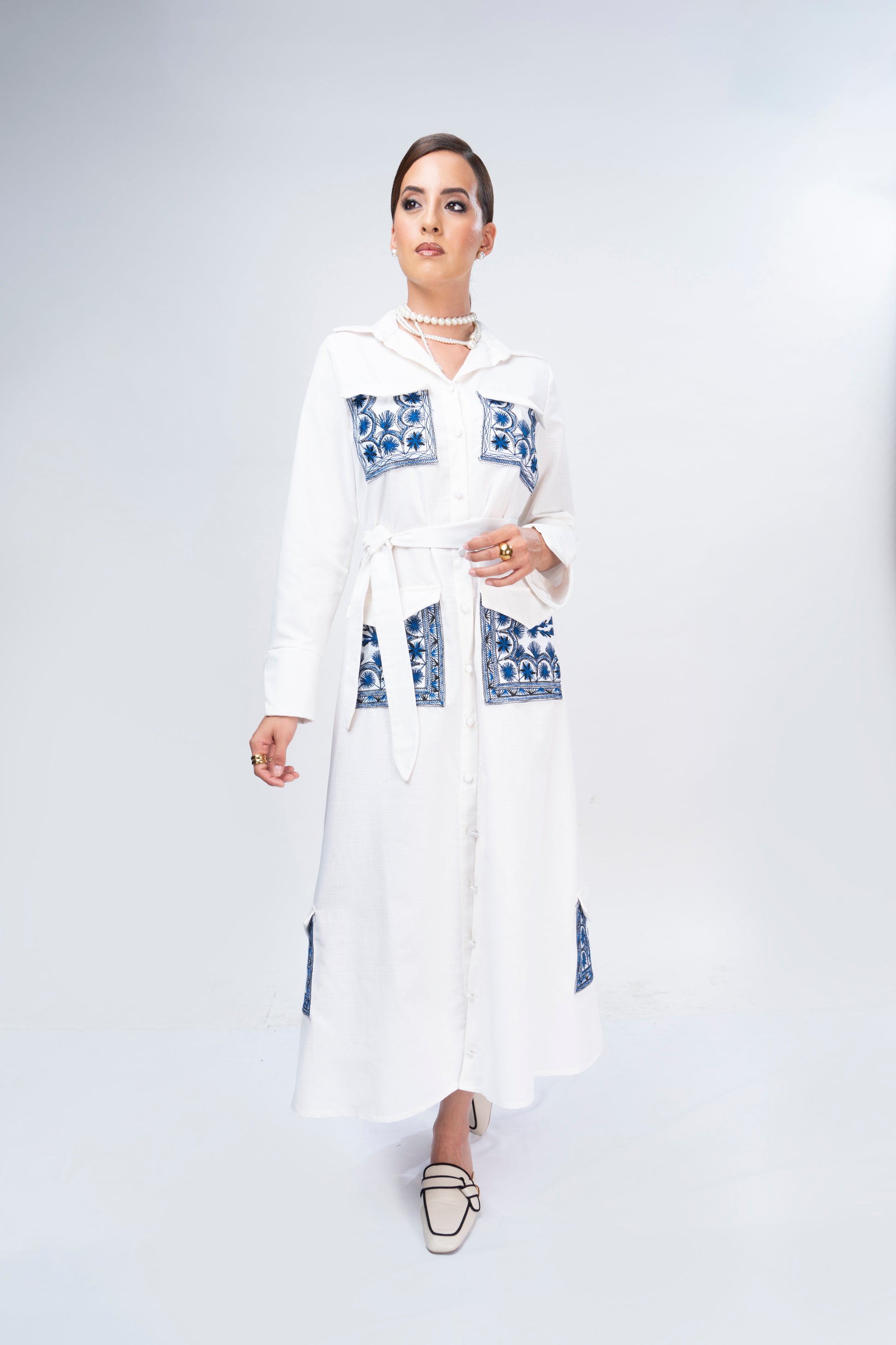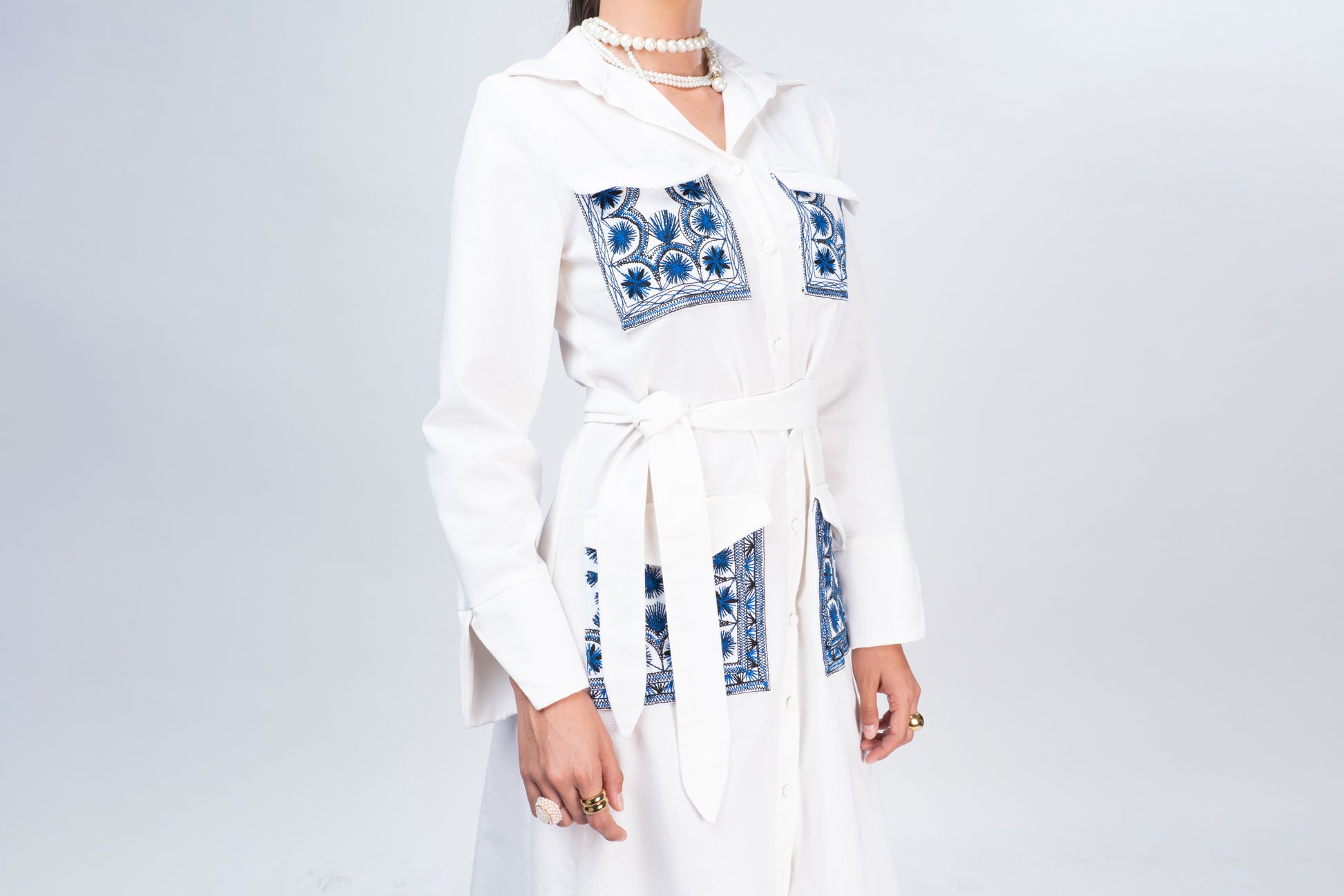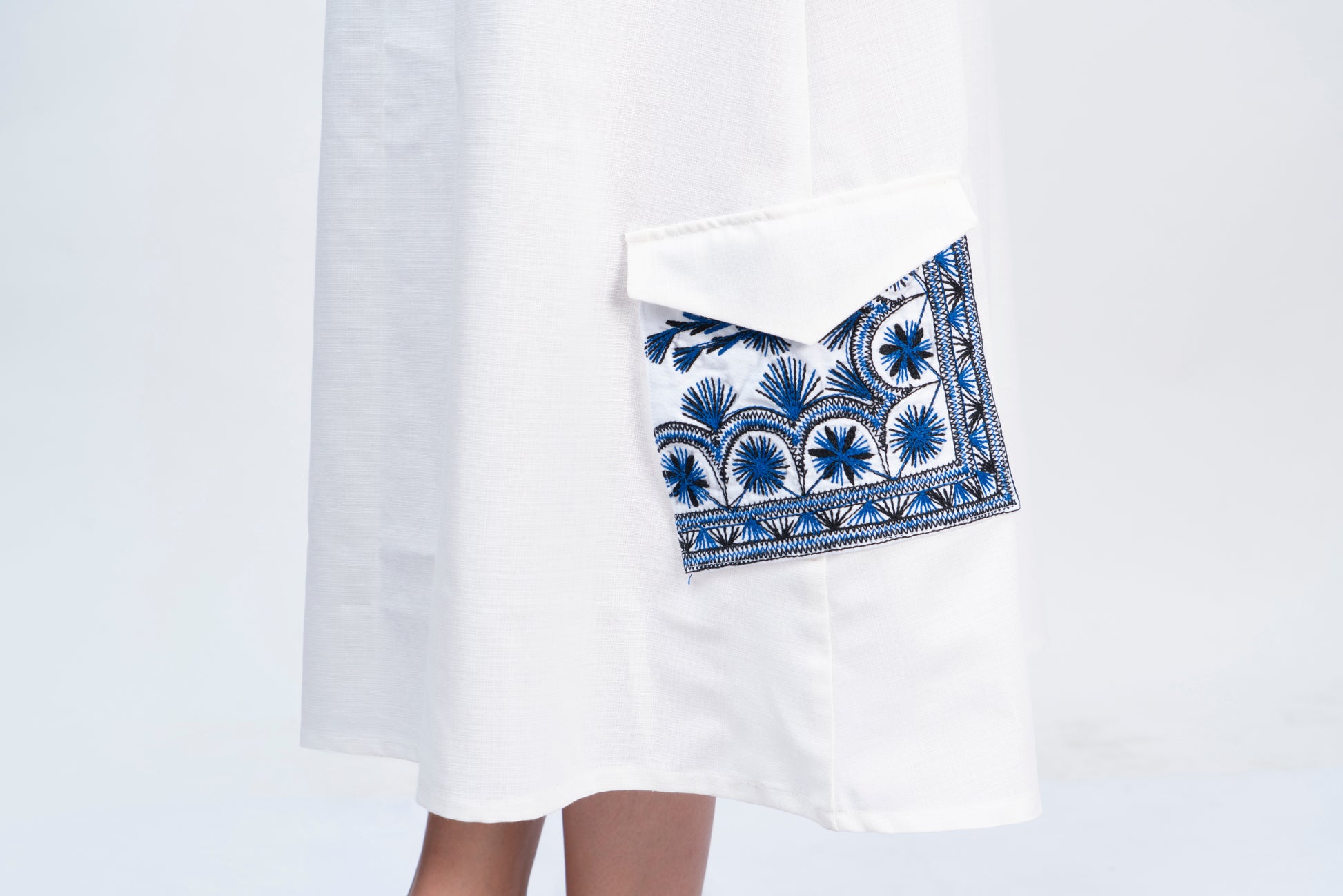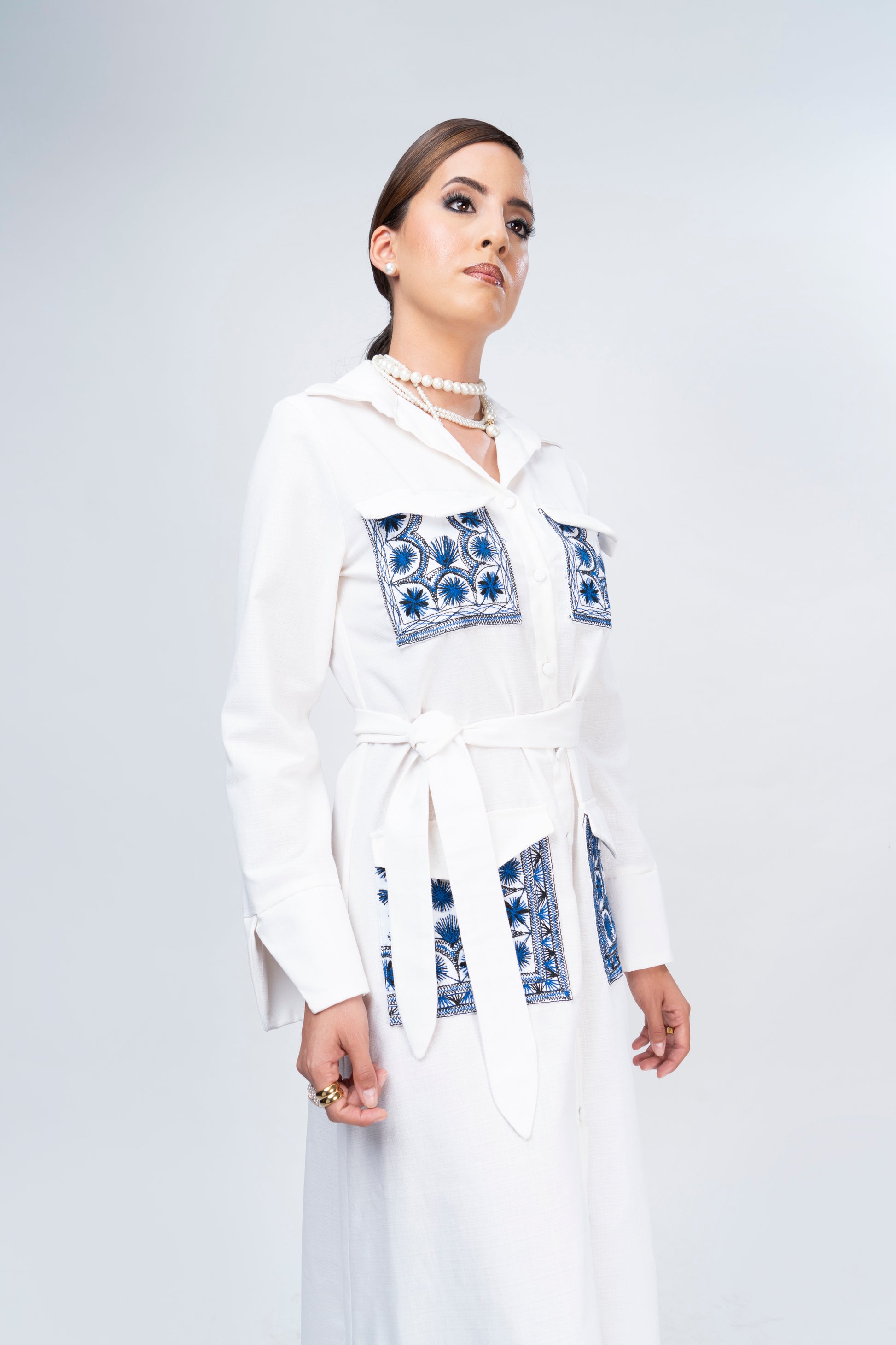 Vestido de lino blanco tipo cargo con bordado de magueyes y soles originario de Tlahuitoltepec, Mixe Oaxaca.