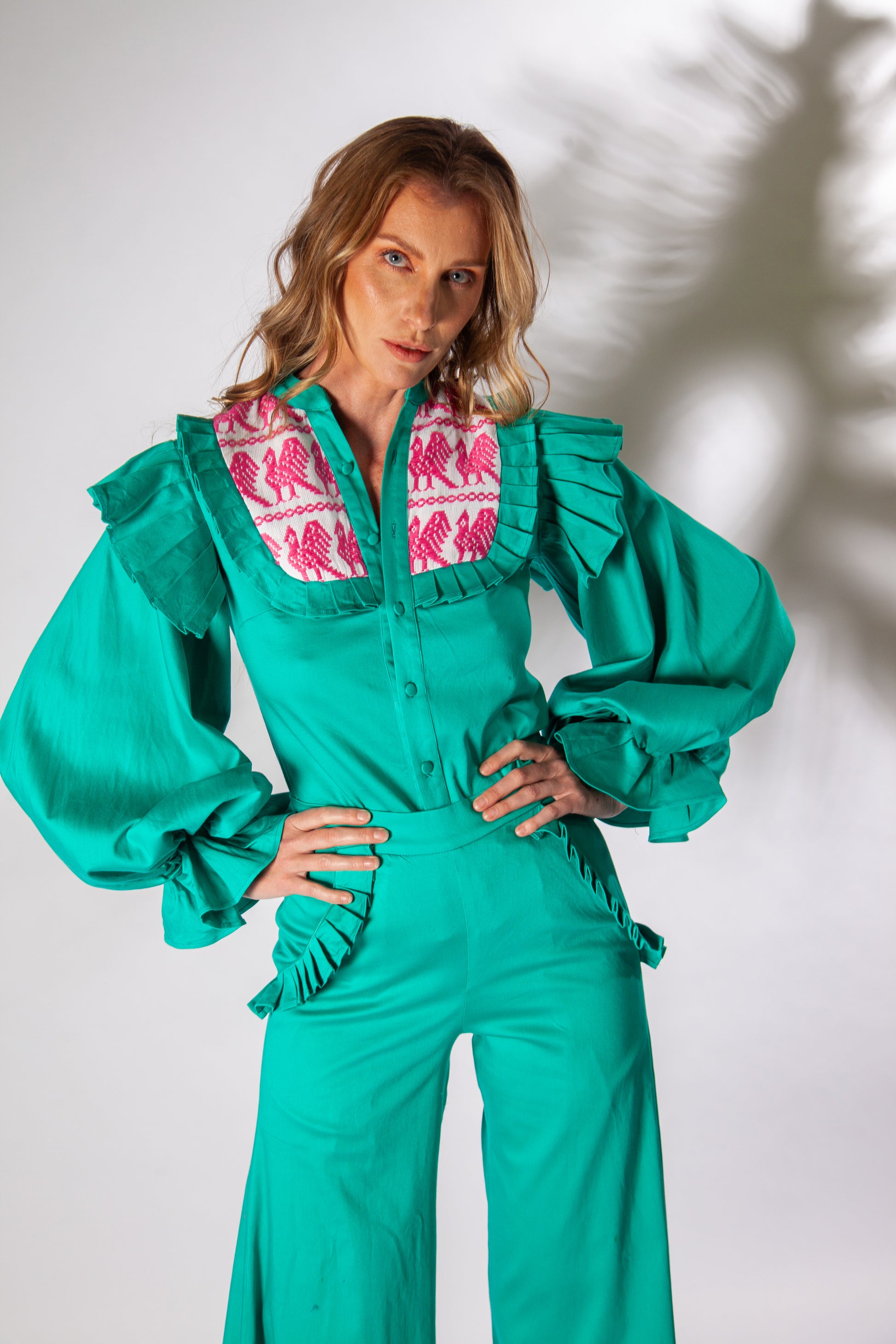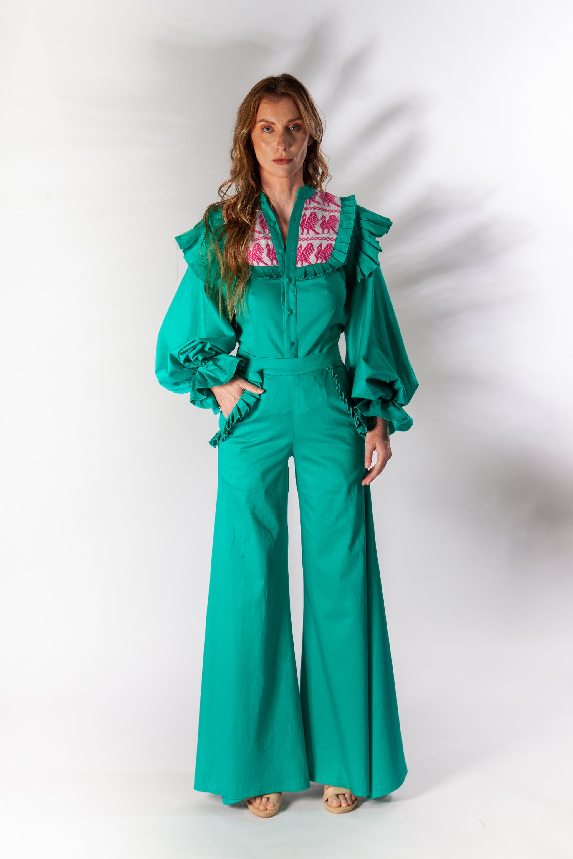 Pantalón de pierna ancha con bolsas adornadas con tablones en gabardina
